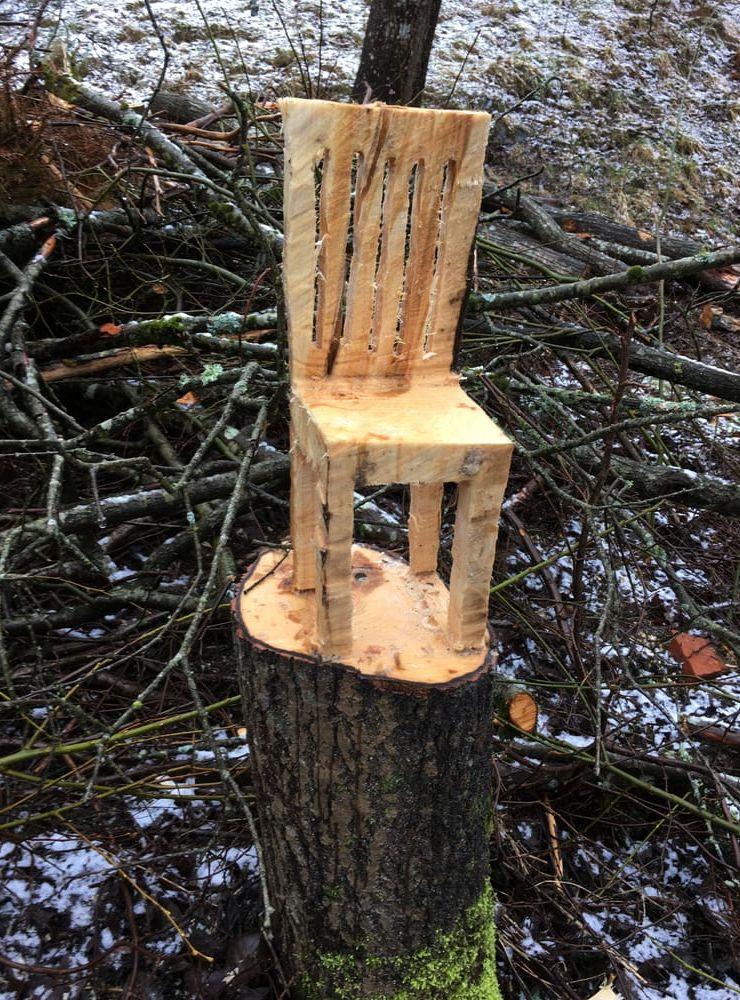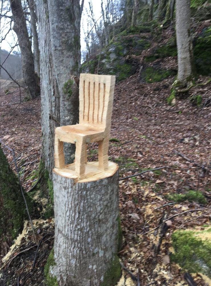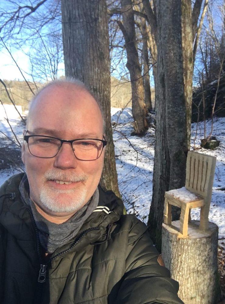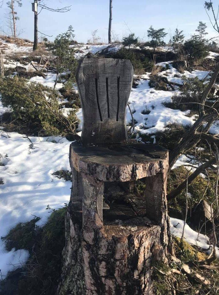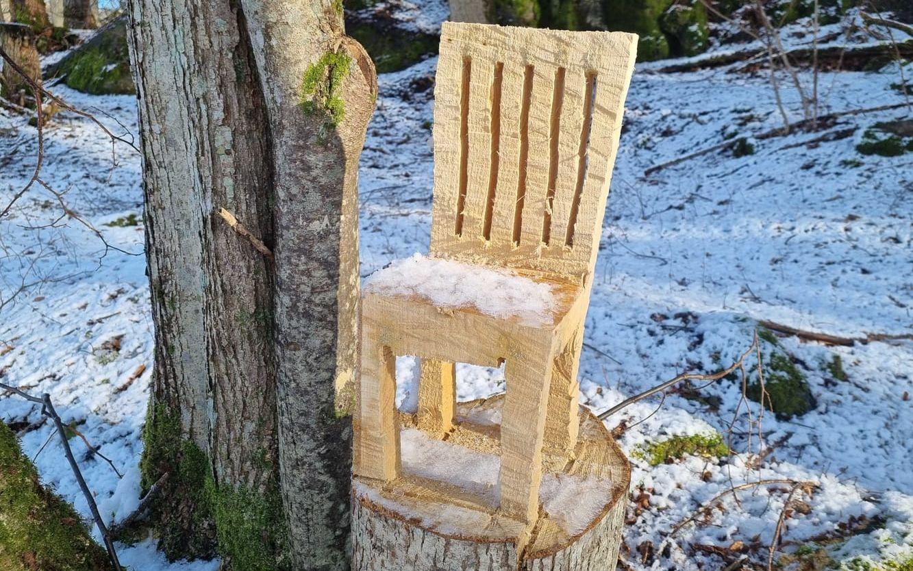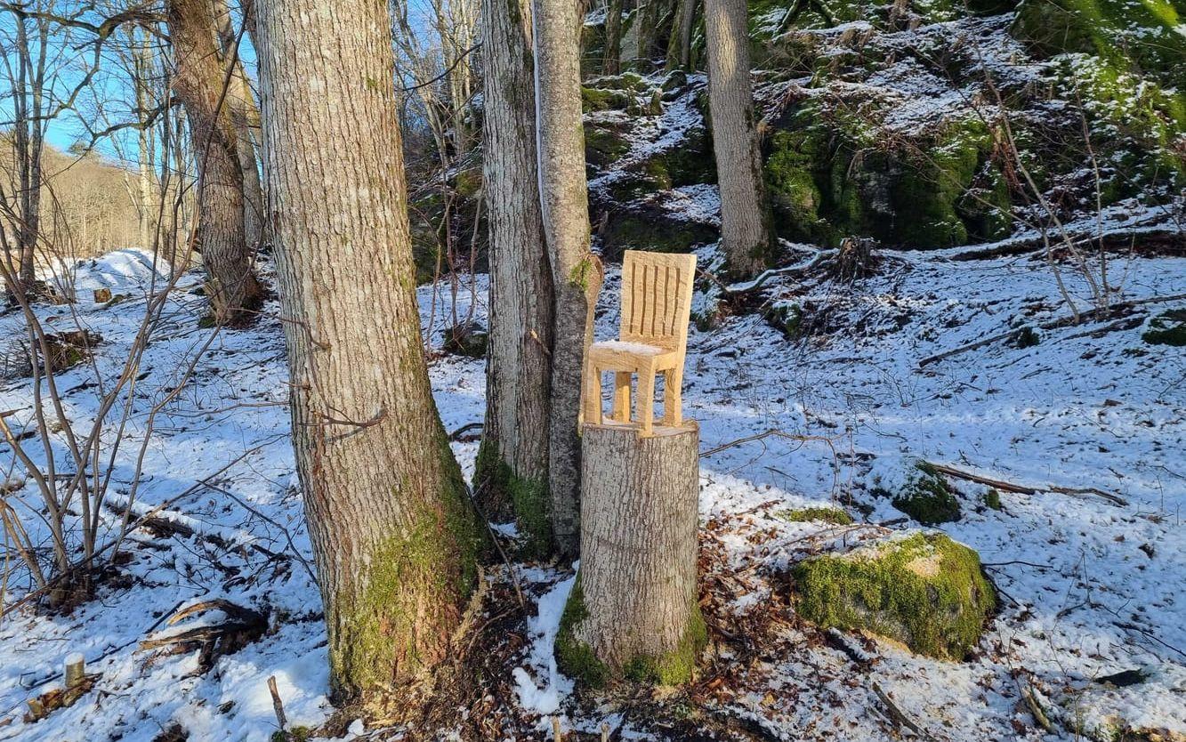 Under söndagen kan nästa stol läggas till på skattjaktskartan. Jörgen Andersson berättar att han har sprungit på en trästol under en promenad i början på förra året. Då vandrade han på Bohusleden mellan Glimmingen och Stenshult, där fotade han då den här träskulpturen.
